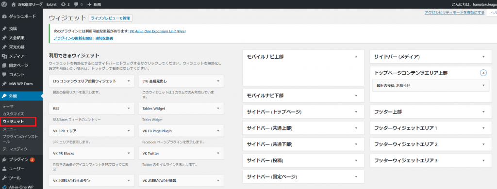 ウィジェットへは,外観ウィジェットで設定画面を開きます。ウィジェットで設定できる場所と項目は,テーマ及びプラグインにより異なります