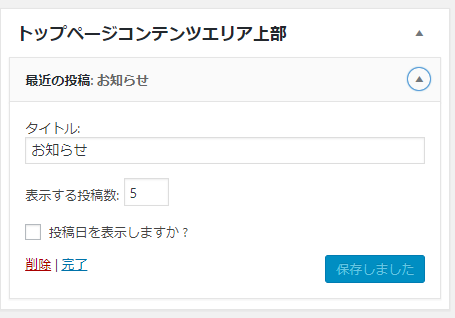 ここではお知らせと入れておきました。最新の投稿は,必ず投稿ページが表示されます。固定ページやカスタム投稿のページは表示されません。投稿数はデフォルトでは5になっています。