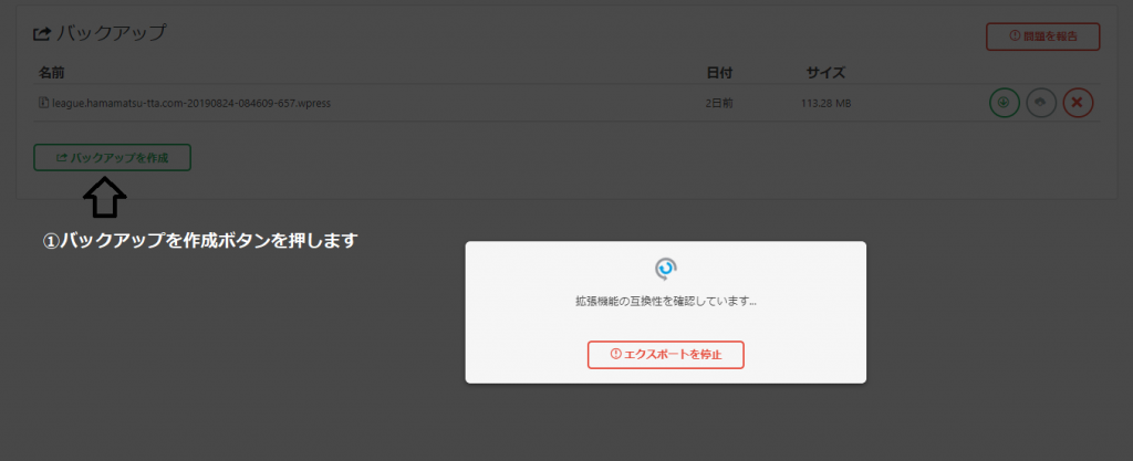 バックアップを作成ボタンを押し,エクスポートを開始します。