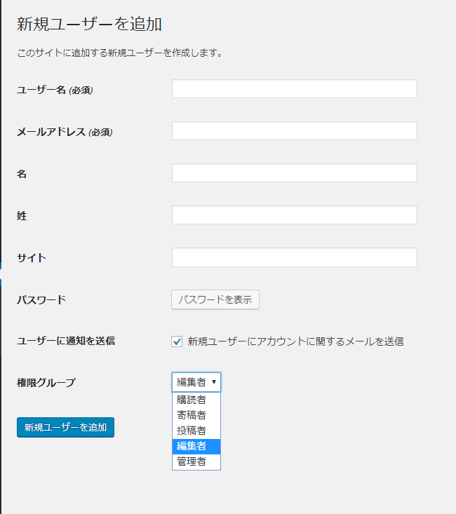 ユーザー名,メールアドレスを入力し,権限グループを選択します。