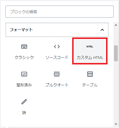 ブロックの追加フォーマットカスタムHTMLでブロックを挿入します。
